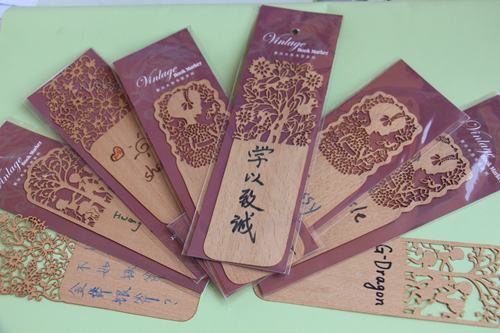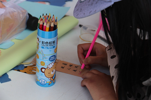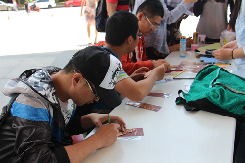 此次活动的形式非常简单明了,但凡对自制藏书票感兴趣的同学,都可以向在场的工作人员领一枚书票,并用工作人员提供的彩笔进行自己的艺术创作,完成之后便可以将书票带走留作纪念。在活动现场还放置了学习部的同学们自己制作的书票样本以供大家参考。由于样本书票制作得非常漂亮,现场很快就聚拢了不少同学询问活动详情。当桌椅布置好以后,便有陆陆续续的同学上前参加活动。活动现场的氛围很热闹,一拨一拨的人来了又走。有的同学在书票上写下关于读书的句子,有的同学则画出美丽的花纹,也有同学将书票涂得花花绿绿。总之,同学们制作的藏书票可谓是各不相同,各有风采。