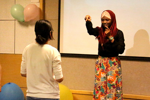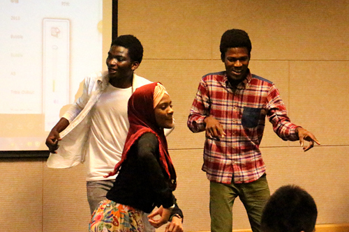 其后,来自尼日利亚的留学生林峰向大家介绍了他的家乡。林峰用流利的中文与大家进行交流,并通过一张张精美的照片,使大家了解了尼日利亚的地理位置、特色美食、传统节日以及传统音乐等。其中,他特别强调了尼日利亚南部的钓鱼节以及西南部的Eyo节,按照习俗,大家在Eyo节这一天是不穿鞋子的。到了提问环节,现场观众更是踊跃地提出了一系列问题。当有人问及林峰的唱歌跳舞天赋如何时,林峰便邀请在场的非洲小伙伴与自己一起唱歌跳舞。激情的音乐响起,三名非洲留学生在台上跳起了特色舞蹈,台下的观众为他们打着节拍,一同沉浸在欢快而充满活力的音乐声中。