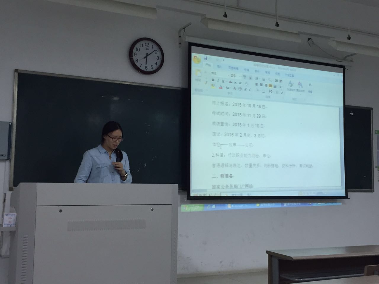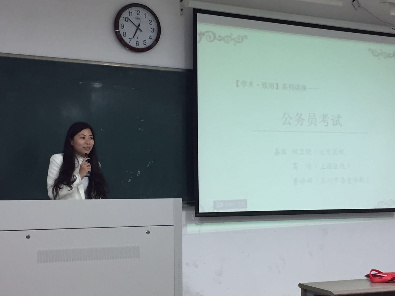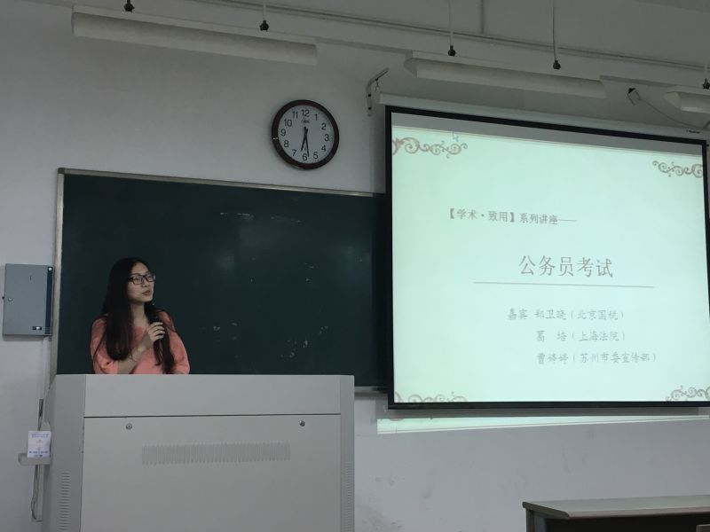 2016年5月20日晚六点,由苏州大学文学院研究生分会主办的【学术・致用】系列讲座之公务员考试讲座在1002#2202如期举办。本场讲座由文学院研究生分会学术部黄�同学主持,邀请的讲座嘉宾有今年成功考上公务员编制的三位学姐:郑卫晓、葛培、曹婷婷。她们分别被北京西城区国税局、上海海事法院和苏州市委宣传部录取。三位学姐在考公就业方面给在场的同学们带来了十分精彩的讲座,让同学们对公务员考试有了深刻的了解。