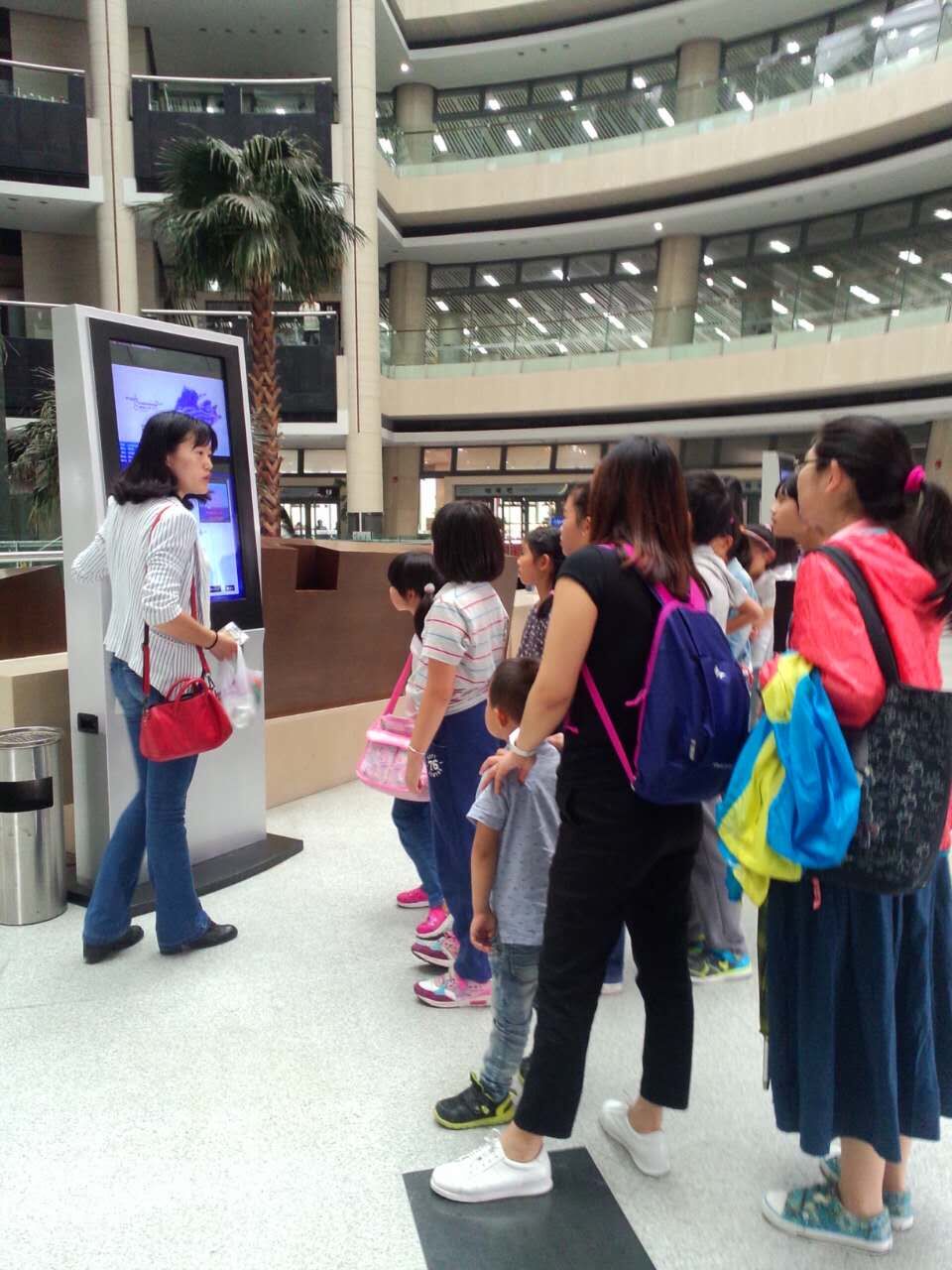 接着,“大手牵小手”一行绕过一期的小花园来到301教学楼,小朋友们参观了大学的教室。和小学校园相比,在大学的教学楼里并没有固定的班级,墙上粘贴的是每天上课的安排,而不是值日生的名单。尽管是在周末,301楼的教室里依然有很多同学在认真地自习。志愿者对小朋友们说,上了大学之后,就没有了老师和家长督促,学习就需要更多的自觉和主动,并希望他们能够从现在开始做学习的主人。
