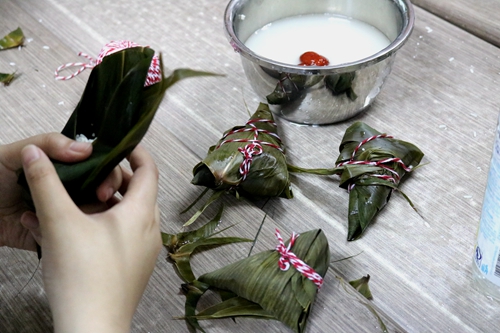 主持人致辞结束后,参与者便开始进行包粽子活动,本次活动为参与者提供了糯米以及红豆、红枣、腊肉三种馅料。中国传统文化传承协会专门派了一名成员指导参与者包粽子,PPT上也演示了粽子的包法,主要可归纳为四大步骤:第一,取2-3片粽叶折成小漏斗形状;第二,加入糯米和馅料,馅料须处于糯米中央;第三,按照漏斗形状弯转粽叶,折出有棱角的三角形;第四,用棉绳捆住粽子并剪去多余的叶子,一个粽子就完成了。