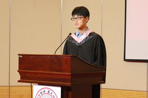 接下来的优秀毕业生代表杨珂的发言,勾起了在场毕业生的无限回忆。杨珂同学在发言中提到了令人倍感亲切的共同记忆,这些记忆俨然成为了文院学子心目中的“苏大符号”:勤劳可敬的食堂阿姨与大叔、任劳任怨的保洁阿姨、家族规模不断扩大的苏大猫、考试前怎么也复习不完的期末提纲……在同学们的掌声中,杨珂同学结束了他的发言。