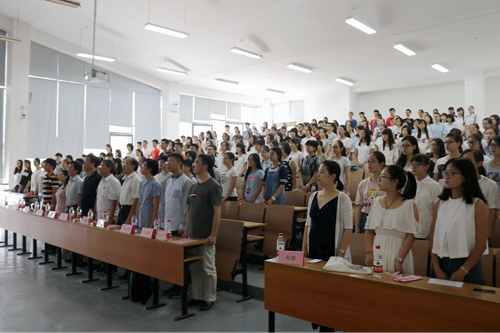 在开学典礼正式开始前,张健书记首先介绍了文学院今年的招生情况,并用幽默风趣的言语解读了新生概况。随后,庄严的国歌在教室中响起,全体师生肃立奏唱,为本次开学典礼拉开了序幕。