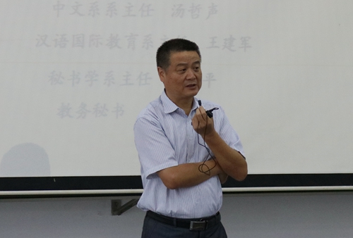 紧接着上台讲话的是中文系主任汤哲声老师。首先,他对即将进入文学殿堂的同学们表示热烈欢迎。他认为,文学是一门关于人的学科,给人以文学情怀和人生感悟,以及最为重要的判断力。他还希望中文系的同学们能利用四年的时光多读书,每个学期要精读一本名著,也要泛读各种类型的书。同时,汤老师也希望同学们能尽快适应大学的教学方法和每个老师的教学特点,更好地融入学习生活。汤老师风趣幽默的语言深深地吸引着在场的每一位同学。最后,汤老师简述了文学院中文系的学习内容,以及基地和师范专业的侧重点等。