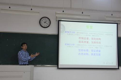 紧接着,马克思主义学院党委书记张才君作为特邀嘉宾为同学们进行本次培训。他首先指出,青年马克思主义者要有“铜头、铁嘴、橡皮肚子、飞毛腿”,认真贯彻“两学一做”。随后,他引用苏联共产党员人数泛滥,却反而解体的案例,结合中国共产党的自身发展实际,得出结论:党员不是越多越好,“我们需要的是全心全意为党服务,为人民服务的党员”。