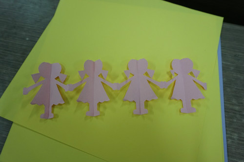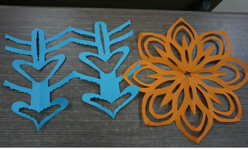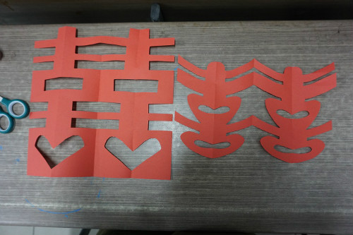 第二个环节是剪纸,由文学院研究生会文体部刘情同学主持。剪纸艺术作为我国的一项非物质文化遗产,来源于人民大众的日常生活,具有民族色彩。首先刘情为大家介绍了剪纸的历史由来,用诗文中的句子来寻找剪纸艺术的存在。“对镜贴花黄”,熟悉的诗句一下子就拉近与到场同学的距离。接着,以图文并茂的方式介绍剪纸的常见用途,如窗花、喜花等,并选择一些剪纸纹样介绍其所具有的内容含义。原来剪纸也有南北派系之分,这让在场同学惊讶不已。刘情以具有代表性的广东佛山剪纸、扬州剪纸和山西剪纸为例,向同学们展示不同派别的剪纸作品。接下来ppt上展示了不同喜字的剪法,同学们拿起纸开始仿照剪裁。不一会各具特色的“喜”字作品就呈现在我们面前。随即,刘情同学又向大家示范如何剪出六角窗花,彩色卡纸在她手中灵活的舞动着,随意地剪了几刀,展开之后的图式让在场同学惊艳不已。大家都跃跃欲试,彩色的碎片随刀起而飞落,手拉手的的小姑娘、五角星,同学们真是创意无限。