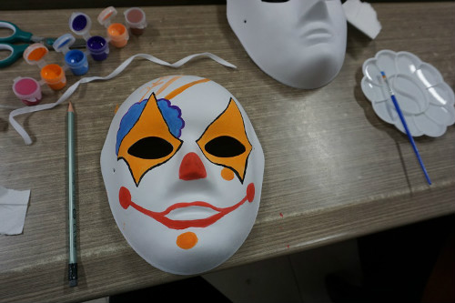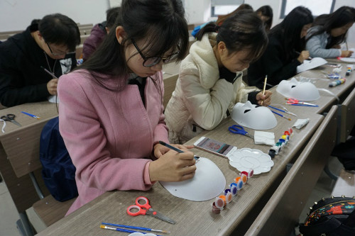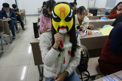 周末午后的阳光暖洋洋,正如同屋内热烈的气氛,欣然暄和。第一个环节是脸谱制作,文学院研究生会文体部王兰兰同学担任主持。首先,结合ppt的展示,她为我们介绍了脸谱的渊源、脸谱种类,重点讲解了京剧脸谱的形成过程,以及京剧中不同颜色的脸谱所代表的不同含义。如:红色代表忠贞、英勇;黑色代表刚正不阿。同学们听得津津有味。接下来,她为大家展示了绘制脸谱的大致流程,呈现一些具有代表性的脸谱图案供参与活动的同学进行欣赏和选择。下面便是同学们大展身手的时刻啦。同学们纷纷拿起铅笔,在雪白的脸谱上细细勾勒出眉眼唇须,用丙烯颜料调配出斑斓的色彩,均匀涂抹在面具上。有的拿出手机照着刚刚拍下来的脸谱样子细致地描摹着,有的同学发挥创造,用色大胆跳脱,绘制着独一无二的个性脸谱。
