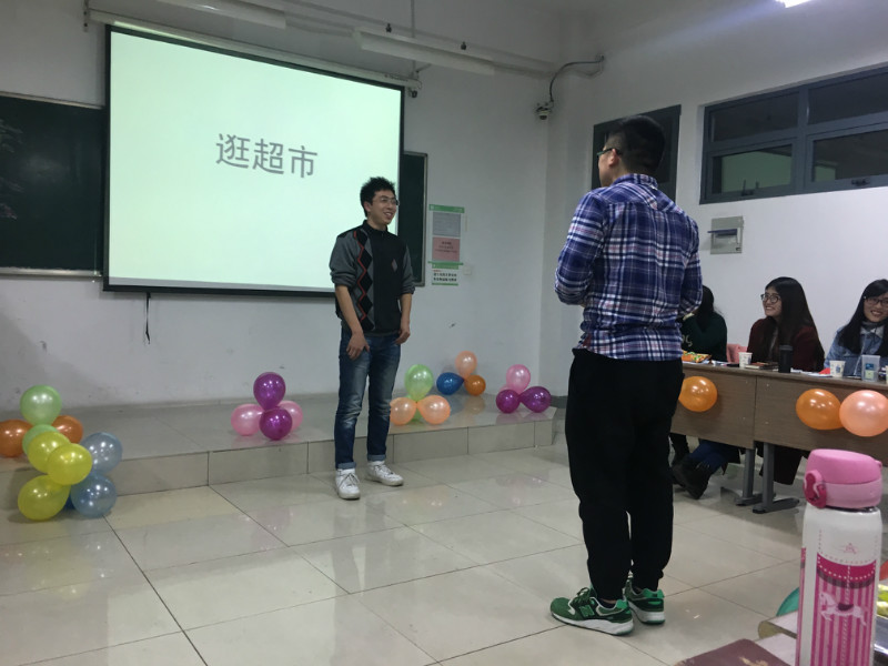 热烈的舞蹈与浪漫的对唱过后,同学们喜闻乐见的游戏环节到了。“看眼色”这一游戏,考验着同学们的反应能力与记忆力,主持人将与会人员按部门分成四组,依次进行了小游戏。原本熟悉的同学在游戏紧张的氛围中一下子想不出对方名字的窘迫模样惹得现场观众欢笑连连。最后,每个小组胜出的人被奖励了可口的小零食,而输了的同学则需要接受惩罚,用家乡的方言朗读古诗文。紧接着,第二个游戏“你划我猜”也来了,各个部门分别派出各自的默契搭档比划猜词,各种意想不到的词语和联想纷纷出现,台下的同学们一边替台上猜不出的同学们感到着急,一边又为了思维的触角怎么也搭不到一起的搭档而忍俊不禁。