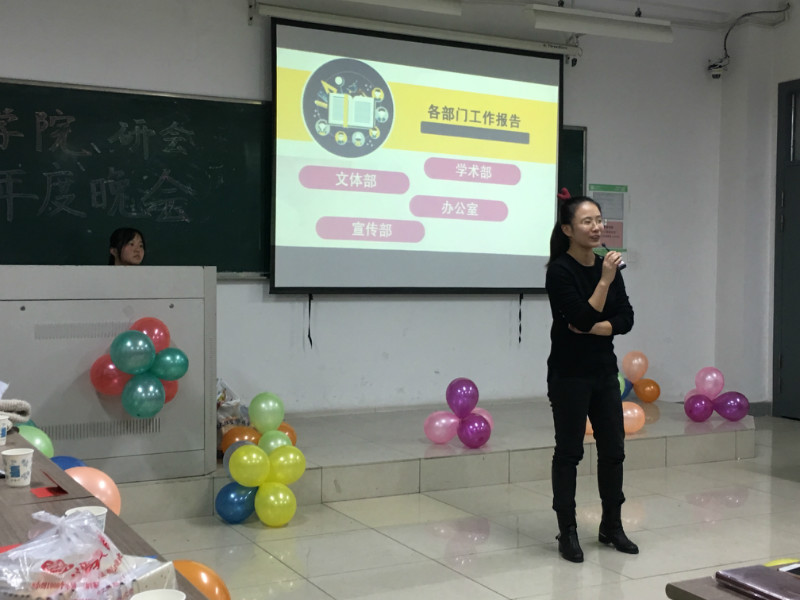 晚上6:30,年会正式拉开序幕。主持人方硕文简单介绍本次年会之后,文学院研究生会主席黄�用“焕然一新”和“生机勃勃”两个成语来总结了研会这半学期的工作成果,并表达了对新的一学期工作的期冀。随后,研会各个部门也总结了这学期的部门工作。学术部部长缪君妍、文体部部长景如月、文体部分管副主席王丽丽、办公室分管副主席戚悦及部长何盼、宣传实践部分管副主席闫思含及部长郁蓉蓉依次汇报并总结了本学期部门工作,也展望了新一学期的工作,表达对未来工作的希望。