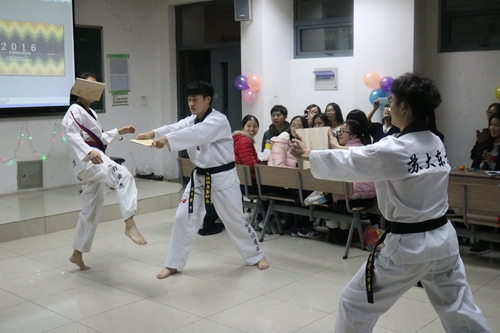 晚上18:30,主持人徐敏、姜礼宣布年会正式开始。开场的跆拳道表演使现场迅速升温,活力迸发的动作瞬间点燃全场气氛。随后,外联部的同学用一首《音乐之声》,把大家的情绪从激情澎湃代入温馨愉悦。接下来,主持人用一连串的卖关子,引出了下一个节目――男声独唱《方圆几里》。缓缓的旋律,在文宣部干事李想同学的演绎下深情而柔美。