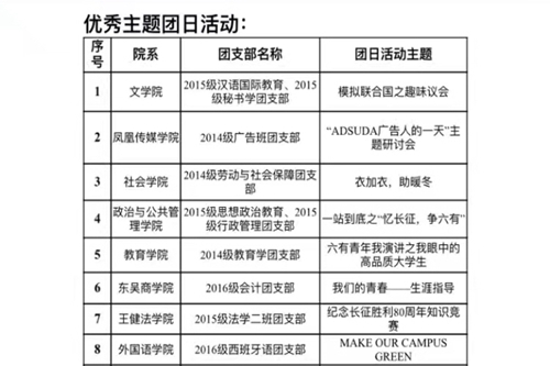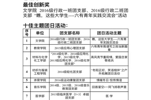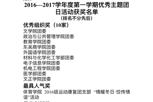 在最新发布的苏州大学《关于表彰2016-2017学年度第一学期优秀主题团日活动的通知》和《关于表彰2016年本科生创新能力培养计划工作推进奖的决定》等文件中,学院团委获得了主题团日相关的五个奖项、“苏州大学2016本科生创新能力培养计划工作推进奖”等。