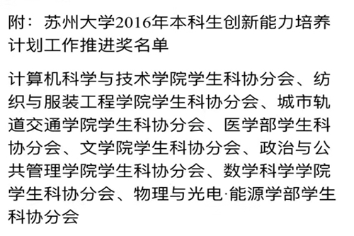 我院积极响应苏州大学本科生创新能力培养计划,在平时的学生工作建设中高度重视学生科技创新能力的培养,有条理地组织学生工作的开展,指导相关活动并对其提出合理意见。在学院的有序推进下,文学院学生参与科技创新的热情不断高涨,一批又一批的科技创新品牌活动不断涌现,有力提升了学生科技创新素养。文学院学生科协分会也因此获得了“苏州大学2016本科生创新能力培养计划工作推进奖”。