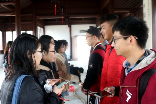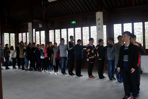 经过中午的片刻休息后,大家前往石湖公园进行接下来的活动。游戏场地定在石湖公园内的一栋古色古香的建筑内。首先,同学们分成两队进行拔河比赛。其中,第二轮比赛分成了文学院代表队和电子信息学院代表队,在旁观者的加油助威声中,文学院同学最终取得了拔河比赛的胜利。