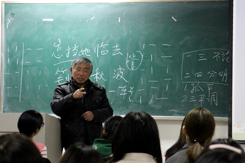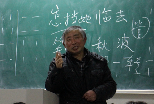 然后老师讲到了音步和格,强调律诗一定要有一定的变化和多种搭配。格即风格,是指人们对几乎所有事物的一种感性的定位,在古代苏东坡以诗为词混淆了诗和词的界限,而李清照却强烈推崇“词别是一家”。七律的格首推杜甫,其阳刚之美和阴柔之美被后世的韩愈,李商隐等人借鉴发扬,而五律的格更为典重,主要是因为朝廷御试诗多为五律。赵老师全程以一种幽默形象的方式向同学们进行讲解,让同学们在开怀大笑的同时也更加深刻的了解了近代诗的格律。