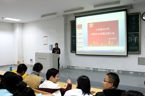2017年3月31日晚18:30,由文学院团委团校主、承办的文学院、唐文治书院2017年暑期社会实践宣讲大会在文综楼1001#1101教室如期举行。参加宣讲会的有2016级全体学生、2015级各班班长及团支书。文学院团校秘书长李欣舒作为此次会议的主讲人,她将宣讲内容分为四部分,为同学们详细介绍了暑假社会实践概况。
