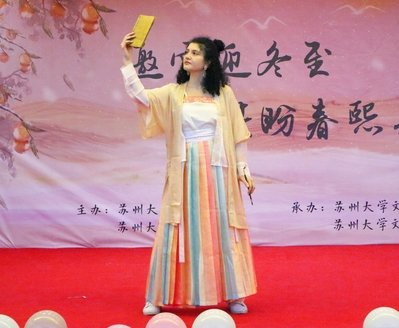 在现场热烈的气氛中,晚会表演正式开始。学生会文艺部首先带来了轻盈灵动的开场舞蹈《无名之花》。19级唐文治书院的李凌云、李思睿、王明敏、赵雨表演了令人动容的歌舞串烧《情书》。在青年志愿者协会带来的小品《内卷不绝?绝不内卷》中 ,演员们生动的表演启发了在座同学不要在内卷中迷失了自我。留学生和文艺部的汉服走秀《子衿》让观众深切感受到了汉服之美。21级研究生张心雨动情演唱了歌曲《飞云之下》,赢得了观众们的阵阵掌声。