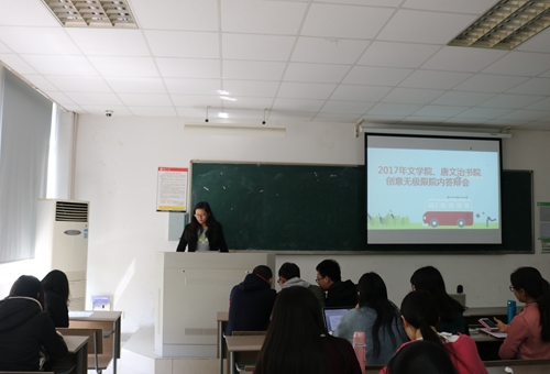 4月12日下午一点半,由文学院团委团校举办的2017年“创意无极限”暑期社会实践院内答辩会在文综楼1003#3105教室顺利举行。此次答辩会的评审团由文学院团委副书记、2016年文学院暑期社会实践负责人马嘉雯,文学院团校秘书长、2016年文学院暑期社会实践先进个人李欣舒,文学院团委宣传部部长、2016年“创意无极限”大赛校级获奖团队负责人沈昕以及文学院学生会主席高祺琪四人组成。文学院及唐文治书院共37名立项负责人聚集于此,与大家共同分享自己的立项创意与内容。