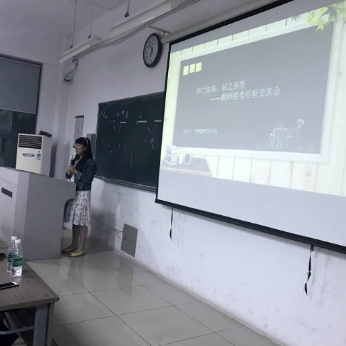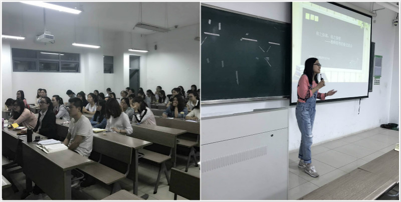 本次经验交流会由文学院研会学术部成员杨丽莉主持开场,她向大家介绍了交流会的出席嘉宾,她们分别是文学院学科语文专业的三位研究生二年级同学:杨帆、罗丹丹和王羽,这三位同学将以自己的经历向大家介绍教师招考的经验。