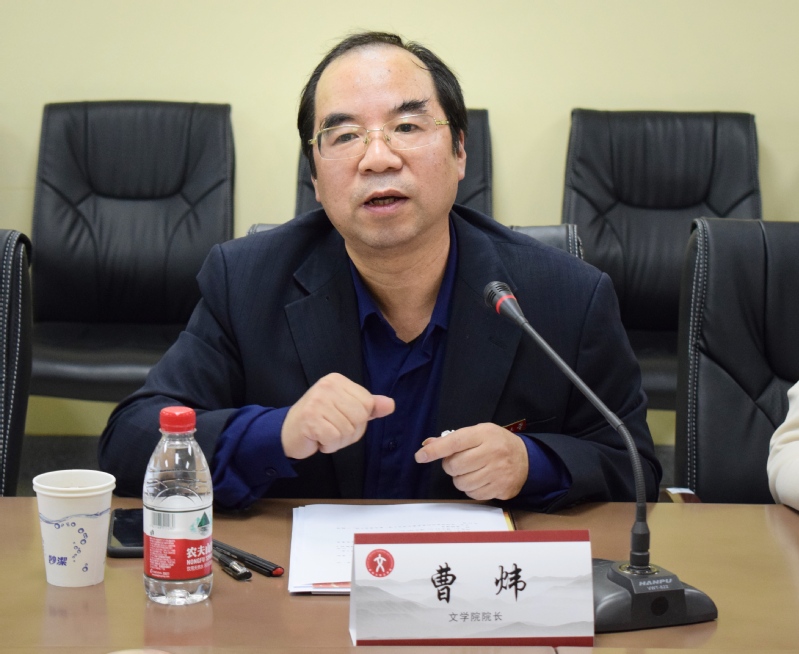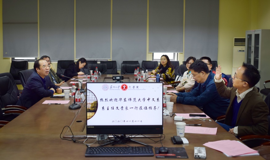 华东师范大学中文系系主任文贵良对我院学科设置和师资力量表示肯定,他赞誉了我院历年来所获成就,希望我院能在曹炜院长率领的领导班子指导下再创辉煌。随后,文主任等领导介绍了华东师范大学中文系在党建工作、学科建设、师资队伍、研究生培养、本科生培养等方面的经验及特色做法。