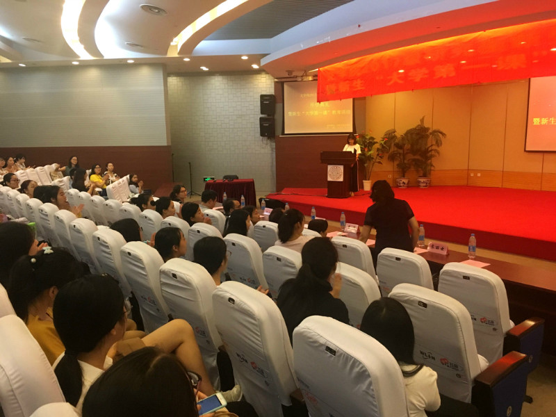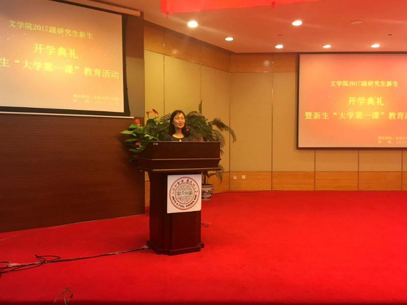 而后,文学院党委书记孙宁华为全体老师和同学致辞。她介绍了文学院历史概况及办学理念,并欢迎来自五湖四海的新同学,希望他们利用学校里的一切有利资源,汲取知识,提升情操,并对他们寄予了厚望。