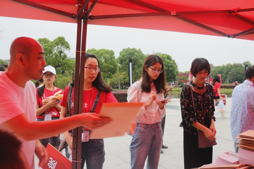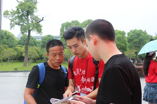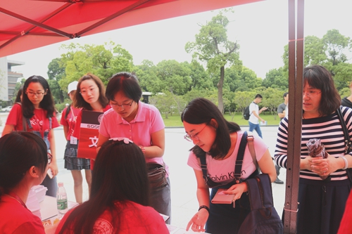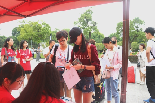 2017年9月9日早晨五点半,一群身穿红衣的文学院志愿者们来到炳麟图书馆前支起了帐篷,早早地为2017年新生的迎新工作作着准备。他们井井有条地作着安排,整个报到的流程清晰明了,负责人员都各司其职,17级本科生辅导员陆亚桢也参与了此次迎新活动。