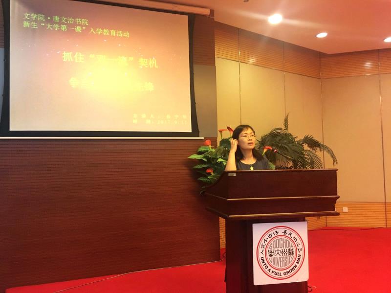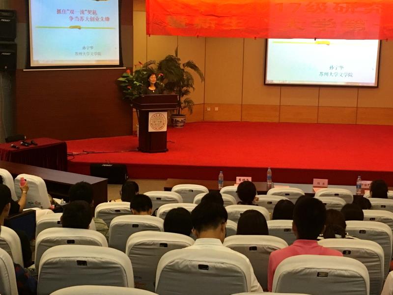 9月11日18:00,苏州大学文学院2017级研究生新生开学典礼在独墅湖校区一期炳麟图书馆学术报告厅举行,在开学典礼流程结束后,院党委书记孙宁华为在场的文学院和唐文治书院的新生做了主题为“抓住‘双一流’契机 争当苏大创业先锋”的入学教育活动。