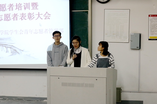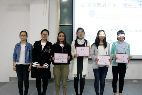 首先进行的环节是宣读志愿者名单、并为他们颁发证书,他们分别是管月、袁继美、谷雅寒、余小云、徐晶莹、胡海燕。稍后优秀志愿者代表管月同学上台发言,分享志愿经历和志愿感悟。她说,志愿者们应该带着爱心和热情多去参加志愿活动,不仅为了那些需要帮助的人们,也为了自己能够有所收获。