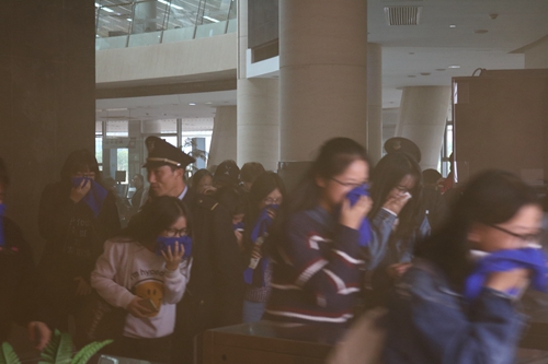 13:30分左右,消防疏散演练正式开始。图书馆外燃烧的消防烟雾弹迅速制造出大量橘红烟雾,烟雾进入图书馆内部,触发烟雾报警器,引起学生警戒。馆内学生牢记逃生知识,把事先发放的毛巾用水打湿并捂住口鼻,迅速有序地从图书馆正门撤离现场。同时,图书馆工作人员在正门进行人员疏导,独墅湖校区消防科人员迅速出动,身着专业装备、手持灭火器进入图书馆内进行灭火。