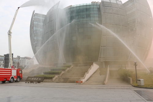几分钟内,所有参与消防疏散演练的同学成功陆续撤出图书馆。宋春毅同学扮演的受伤者头戴消防防毒面具、身着专业防护服,在两名消防队员的搀扶下安全撤离图书馆。独墅湖消防中队消防车随即赶到,消防官兵迅速安装好消防水带,在图书馆馆外开展灭火行动。在全体消防官兵与学校工作人员的努力下,火势得到控制,模拟演练顺利完成。