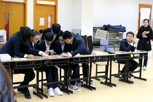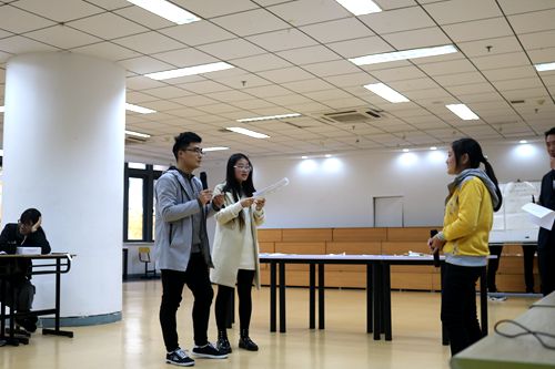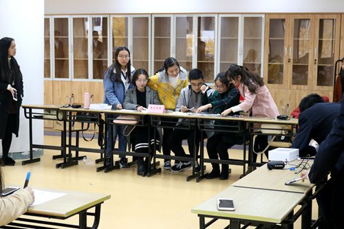 第二环节为诗词连连看,与第一环节要求相同,各组在抽完题袋之后便开始了激烈的讨论。每一小组的题袋中均为碎片诗句,要求所有成员一起开动脑筋拼出三首完整的诗,最后写在白纸上。冬季的寒冷丝毫没有影响到同学们对诗词的热情,大家激烈地讨论,各有分工。最终在大家的共同努力之下,他们也都顺利地完成了任务。
