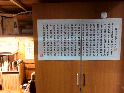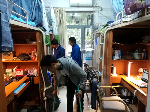 一点整,在参与活动的同学聚集并抽签决定了交换对象后,大家便立马投入了紧锣密鼓的宿舍装饰环节中。首先能看到A01幢117室的刘振铎、郑宇东和潘云伟三人正在对寝室进行相关布置,动作迅速而流畅。郑宇东同学打扫地面、潘云伟,刘振铎二人用漂亮的毛笔字作为装饰品,显得古韵十足。抬头环顾四周,蓝色木板形的的墙纸为宿舍平添了几分美意,真称得上洞天福地。