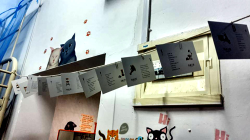 335宿舍的同学则主要以猫为装饰主题。做成帘子的明信片上的猫、趴在电灯开关上的猫、藏在小角落里的猫,每一只都形态各异,或卖萌,或搞怪。最可爱的是在洗漱台的镜子上面的那两只猫,中间贴着的是手写的宿舍公约,左右各一只胖胖的橘猫,瞪着圆圆的眼睛,在这样的目光注视下,想必任谁都不会违反宿舍公约的。