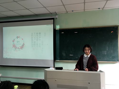 首先,李萍同学鉴赏了古诗《元日》。“爆竹声中一岁除,春风送暖入屠苏。千门万户曈曈日,总把新桃换旧符。”这首诗大意为在阵阵轰鸣的爆竹声中,旧的一年已经过去,和暖的春风吹来了新年,人们开怀畅饮,品尝着新酿的屠苏酒。初升的太阳照耀着千家万户,人们都忙着把旧的桃符取下,换上新的桃符。接着,她向同学们介绍了许多春节习俗,如:放鞭炮、贴春联、喝雄黄酒、剪窗花、包饺子和舞狮等。然后,李萍讲解了同写春节的《迎春》。《迎春》这首诗讲的是立春节气之后,千家万户喜迎新春、人头攒动。最后,她播放了一部关于过年回家的小纪录片――《归》。纪录片详细地拍摄了各地人们春节归家的艰辛与喜悦,令人感动。