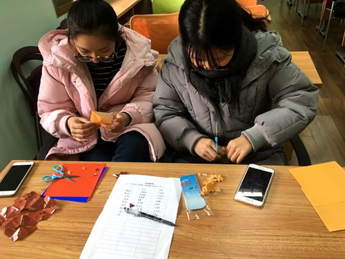 李萍结束讲解后,叶竹岩同学给参加活动的各个同学分发了剪刀与彩纸,教同学们剪窗花。同学们都对此表现出浓厚的兴趣,都聚精会神地剪着窗花。尽管在剪窗花的过程中大家也遇到了一些麻烦,但在叶竹岩同学的指导下,大家最终还是出色地完成了窗花的制作。甚至有许多心灵手巧的同学,不费吹灰之力地一个人剪了好几张窗花。