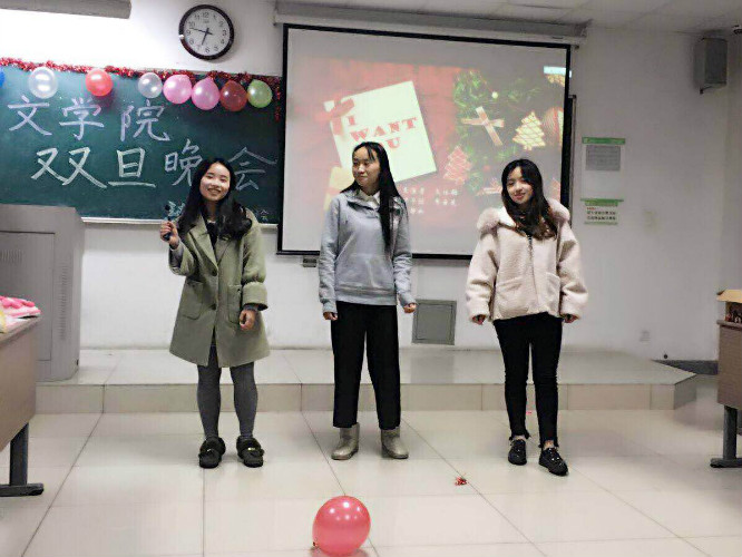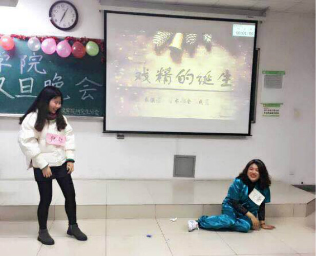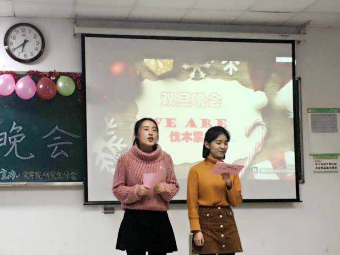 首先登场的是两位主持人,在她们热情的开场白之后,文院研会双旦晚会正式拉开序幕。