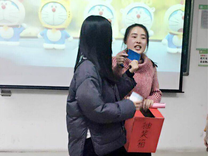 在两位舞者热情洋溢的舞蹈后,又开始了今晚的第三个小游戏――你画我猜:每一部门各派两位代表,两两组合,一个比划一个猜,比划的人可以用语言和肢体动作来进行描述,但是不能出现与题目同音的字词,在一分钟时间内答对题目最多的一组获胜。在一番争分夺秒后,宣传实践部和办公室的小伙伴们获得胜利。