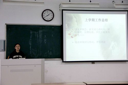 首先,薛伟同学进行了上学期工作总结。一方面,薛伟对各位团支书上学期的认真工作表达了感谢。总结了大家在新生团关系转入、团员推优、团费缴纳、四代会提案征集、统计班级团员情况等工作中的态度和表现作出了肯定。另一方面,薛伟强调,希望在本学期,大家也能继续严谨高效地做好本职工作。