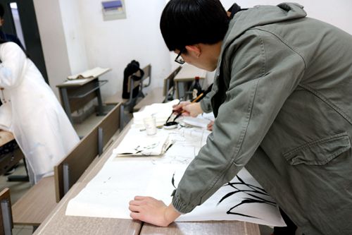 “梅兰竹菊”四君子一向是文人雅客的喜好之品,李国栋老师细致地讲解了兰花与墨竹的绘画方法,并耐心地指导同学们进行绘画实践。学好兰花,基本上就等于掌握了所有花卉的技法处理,而要想画好兰花就必须先练好书法,体会以写字的方法入画。画竹立竿,用淡墨或中墨画竿,要求笔力刚健,细竿用中锋、老竿用侧锋,意在笔先,自上而下,或自下而上行笔,每段两头似“蚕头”、“马蹄”形,而断口笔断意连。多根竹竿画在一起时,李老师则强调要注意竹竿之间的粗细、浓淡、疏密之变化,竹节与竹节之间要参差错落,竹竿与竹竿之间切忌平行。