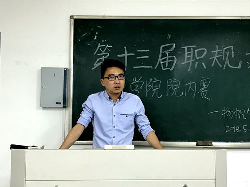 5月7日18:30至20:00,第十三届职规大赛文学院院内赛在文综楼1003#3205教室如期举行。此次活动由文学院团委主办,扬帆学社承办。活动邀请的评委为黄郁健老师和陆亚桢老师,参赛选手分别是文学院16级的朱贵昌、张熙、梁家凌和缪之淇同学。