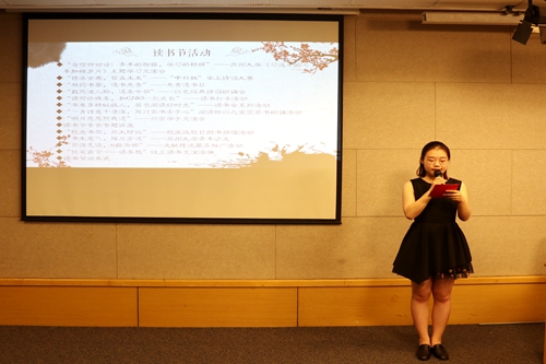 开幕式伊始,钱书记和孙书记分别上台致辞。钱书记认为,读书可以滋养人的心灵、提升人的品味、传承爱国热忱。他回忆起东吴大学师生在抗战期间孜孜以求,为今天留下了丰富的文化宝藏。孙书记提到,读书是文学院学生的本分,尤其在这样一个信息碎片化严重的微信时代,文院学生应该拥有和书籍接触的本能和情感。期待大家能牢记“在文化中前行”的主题,在读书节有所收获。