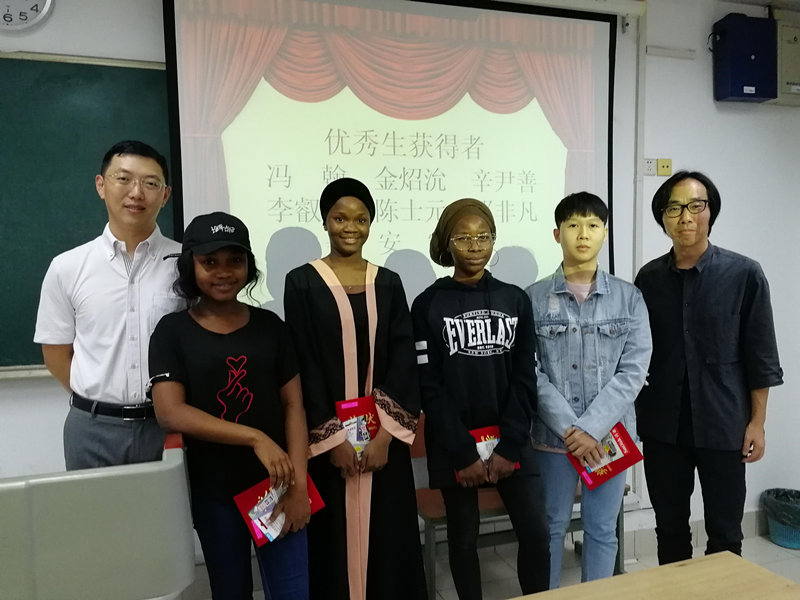 第二项是为2018春季学期成绩优异的学生颁奖。张福亚老师宣读表扬生获得者名单、尼日利亚拉各斯大学王语嫣老师(Mis. Yewande Olabinjo)颁发获奖证书和奖品,束霞平副院长宣读优秀生获得者名单并颁发获奖证书和奖品,并合影留念。