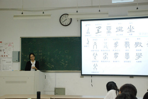 接着,姚老师开始讲述汉字的起源与发展历程。就起源问题,姚老师指出了古代符号与文字的区别。她还表示不能随意以甲骨文的出现作为汉字的开端,汉字的开端仍无法确切考证。从象形文字到意音文字,从甲骨文到楷书,从繁体字到简体字,姚老师讲述了汉字漫长的演变历程。听完之后,在场同学对汉字的发展历史有了更为全面的认识。