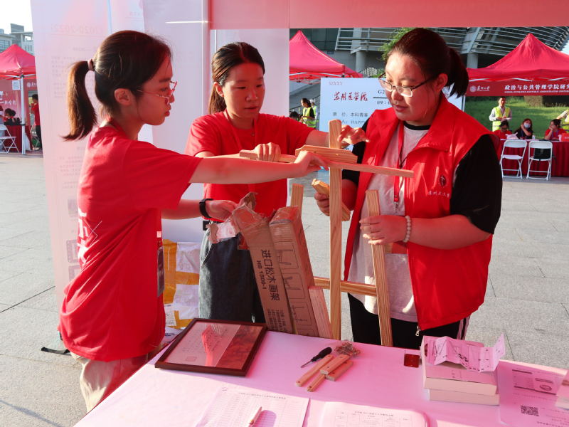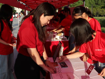 清晨朝阳初起,身着红色工作服的志愿者们就已经开始为迎新做相关准备。他们搬运桌椅,整理材料,摆放物资,布置装饰文学院迎新摊位,并在明确各自任务安排后等待新生的到来。23级辅导员丁小珊老师、陆亚桢老师也与志愿者们一起,在迎新处共同接待新生。