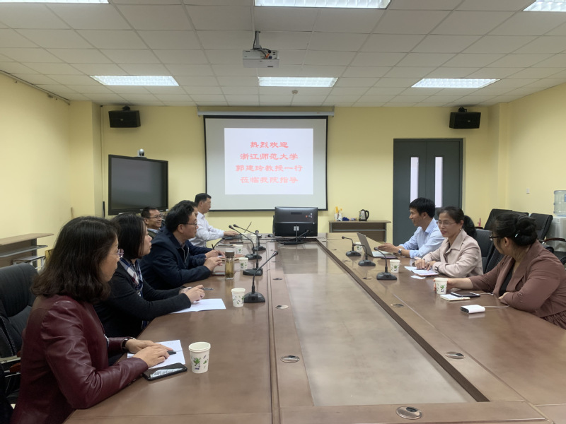 首先,文学院副院长周生杰对浙江师范大学的到来表示热烈欢迎,并介绍了文学院的历史与组织框架。汉语国际教育系主任王建军教授介绍了文学院汉语国际专业的发展与人才培养经验,表达了向汉教实力雄厚的浙江师范大学学习借鉴的心愿。国际交流处副处长朱履骅就我校留学生的管理模式进行了经验分享。双方互相介绍了各自院系的概况,并就汉语国际教育本科人才培养与专业建设、中国文学海外传播等方面进行了深入的探讨。双方一致表示今后将进一步加强两校相关工作的交流与合作。