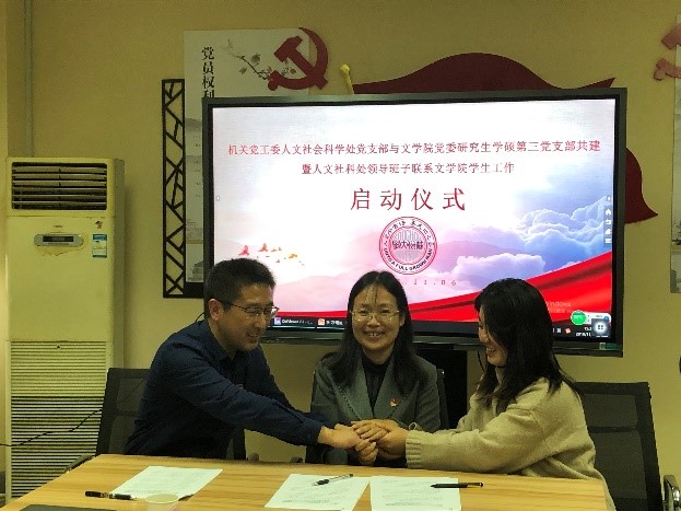 随后进行启动仪式的第四项议程——签署机关党工委人文社科处党支部与文学院党委研究生学硕第三党支部共建暨人文社科处领导班子联系文学院学生工作的合作协议。启动仪式圆满结束。