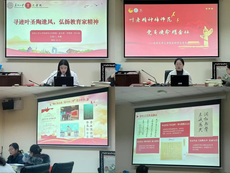 在年度“最佳党日活动”评比环节中,大家聆听了各支部的精彩分享。文学院本科学生党支部开展的“叶老精神传师范”主题党日活动,通过参观叶圣陶纪念馆、理论学习与实践创作,深化对习近平教育思想的理解,传承教育精神;研究生学硕第一、二党支部联合举办的“强国复兴有我”主题党日活动,庆祝新中国诞生75周年与叶圣陶诞辰,通过参观纪念馆和创新活化红色资源,传播教育家精神,获媒体报道;学科语文专硕一、二支部联合开展的“启智润心铸师魂”系列党日活动,结合苏州教育资源,引导成员学习教育家精神,展现青年作为;唐文治书院学生党支部以“修身铸魂植廉于心”为主题,前往教育基地和博物馆,结合党纪学习教育与毕业生党员教育,增强党员政治定力。
