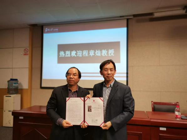 报告开始之前,先由曹炜院长对程章灿教授的学术经历进行了简短的介绍。曹炜院长还向前来参加报告的同学推荐了程教授的文史随笔集《山围故国:旧闻新语读南京》,并向程教授赠予了“仲联学术讲坛”的证书: