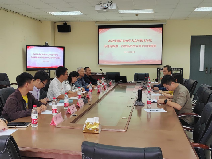 2023年9月23日上午,中国矿业大学人文与艺术学院中国语言文学系主任冯仰操、人文与艺术学院教师高淮生、闫续瑞、邓心强、栗山雅央、王鑫和顾一凡等一行莅临我院开展调研与交流活动。双方座谈会在文综楼1005幢5335室举行。文学院副院长周生杰、中文系副主任张蕾、文秘系副主任朱钦运等出席了本次会议。