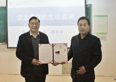 在讲座正式开始之前,文学院副院长周生杰教授代表学院和学生对张长松老师的到来表示了热烈的欢迎,为张长松老师颁发了“东吴语文教学讲坛”纪念证书并合影留念。