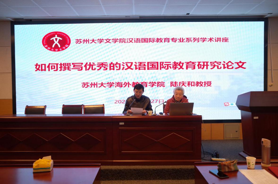11月27日13:30,苏州大学海外教育学院陆庆和教授应邀在文综楼1005#5339会议室为文学院师生带来题为“如何撰写优秀的汉语国际教育研究论文”的学术讲座,讲座由陶家骏老师主持,汉语国际教育专业80多名硕士生、本科生参加了本次讲座。